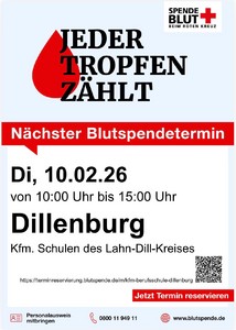 Der Blutspendetag an unserer Schule ist am 10. Februar 2026 von 10:00 bis 15:00 Uhr möglich. Zur besseren Planung wird um eine vorherige Terminreservierung über den QR-Code gebeten.